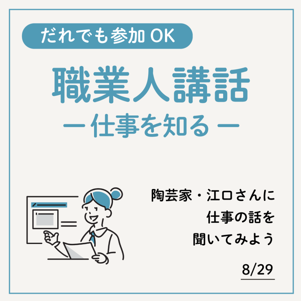 陶芸家として活動されている江口葉菜子さんをお招きします。陶芸家としての仕事内容だけでなく、現在に至るまでの経験やターニングポイント、会社員時代の仕事についてもお話していただきます。働きかたや仕事への向き合いかたなど、様々な価値観に触れる機会になるはずです。
