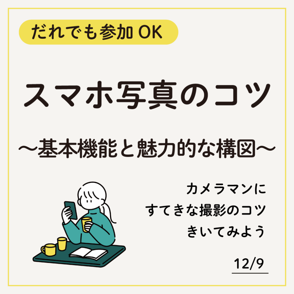 今回の講座では、普段フリーランスカメラマンとして写真を撮ったり展示活動などをしているスタッフが、スマホカメラの基本的な機能から撮るときのコツ、構図について実際に写真を見せながらお話しします。また講座の最後には「写真の仕事」についても少しご紹介しますので、興味がある方はぜひご参加ください。