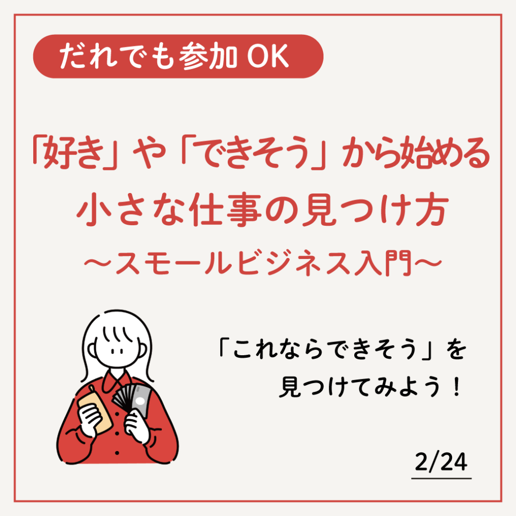 この講座では、自分の「好き」や「できそう」をヒントに、小さな仕事(スモールビジネス)を知り、