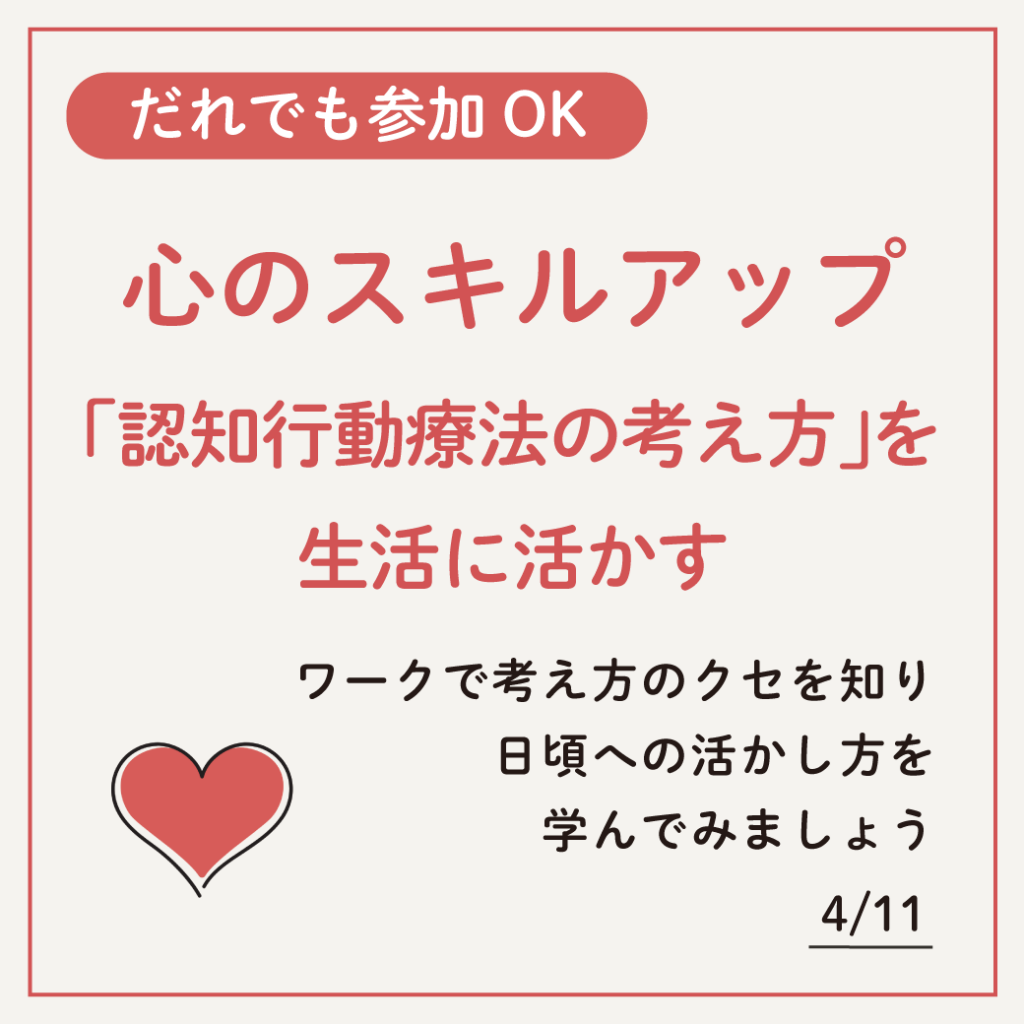 心理学ではとても有名な理論「認知行動療法」を生活の中に活かす方法について、一緒に考えていく講座です。