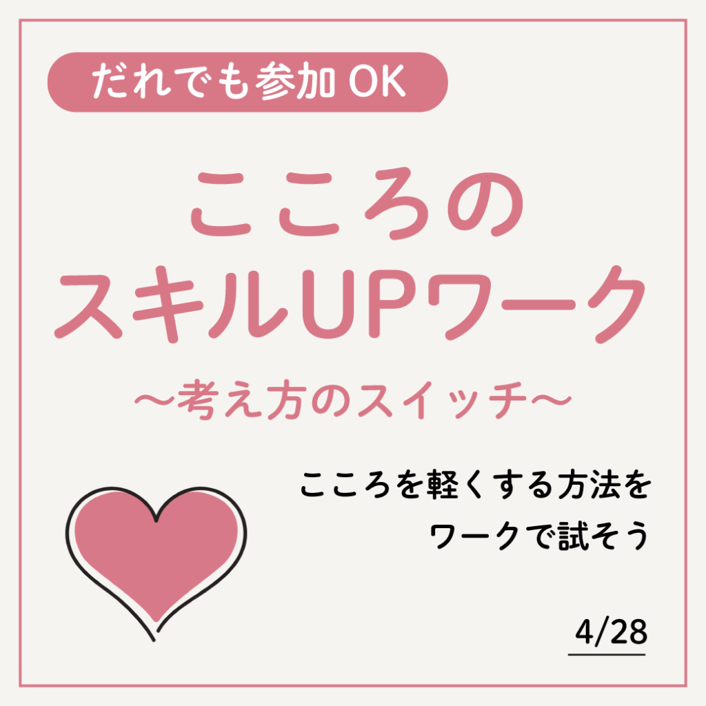 ワークを中心に、心を軽くする方法を試してみる講座です。身近なクイズを通して、「捉えなおし」に挑戦します。いま起きている出来事に目を向け、問題に上手に対処しながら、自分らしく過ごすことを目指します。お気軽にご参加ください。